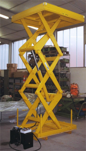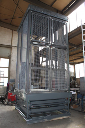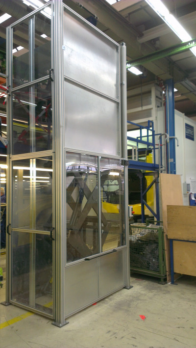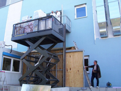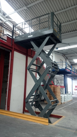 ![]() Dreifachscheren-Hebebühne für die Beschickung eines 2.Stockwerkes. Hebebühne incl. Sicherheitszubehöre wie elektromechanisch verriegelte Türen und Geländer |