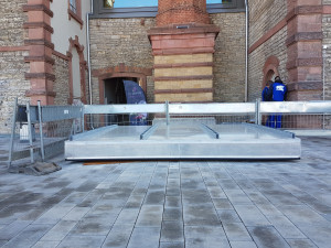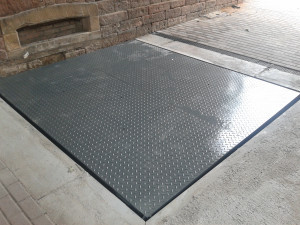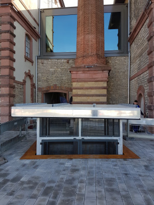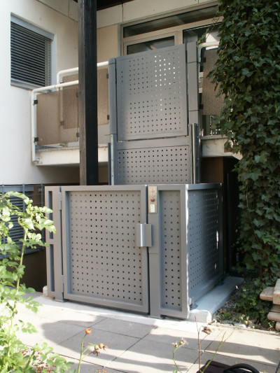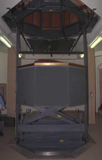 ![]() Hebebühne mit Bolzenverriegelung, durch eine Bodenöffnung wird ein Speisen gedeckter Tisch in das EG verfahren. |
