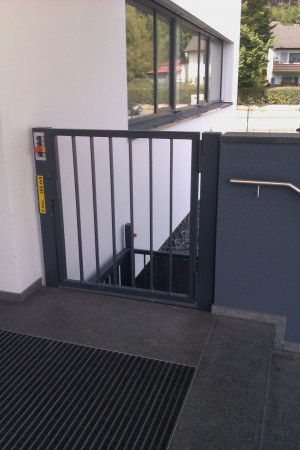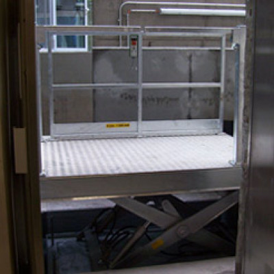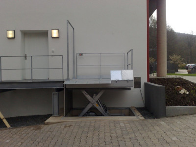 ![]() Serienhebebühne zum Be- und Entladen von kleineren Lasten, incl. Sicherheitszubehör wie Schutzgeländer und Portal-Absturzsicherung. |
