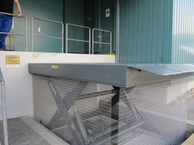 ![]() Serienhebebühne, eingesetzt zum Niveauausgleich zwischen zwei Laderampen und dem Hofnivau. |
