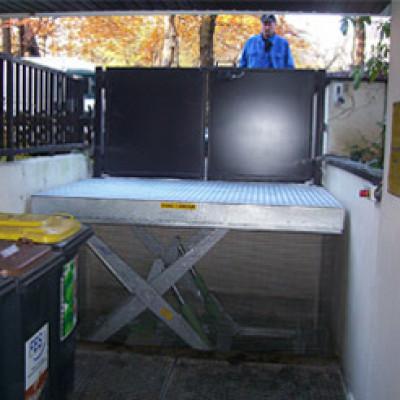 ![]() Serien-Hebebühne, für die Beschickung und Entnahme von Waren aus einem tiefer liegenden Lager. |