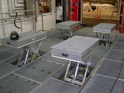 ![]() Pkw befahrbare-Hebebühnen-Gruppe, einzeln und gemeinsam verfahrbar, zur Dichtigkeitsprüfung in der Automobil-Industrie. |