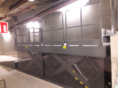 Hebebühne mit Auffahrschräge zum Überwinden eines Höhenversatzes im Untergeschoss eines Bahnhofes. |