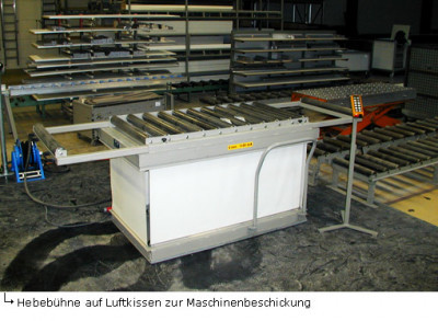 ![]() Hebebühne mit aufgebauter Rollenbahn auf Luftkissen zum leichtgängigen Verschieben, mit und ohne Last. |