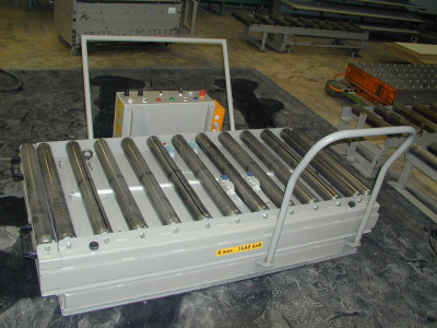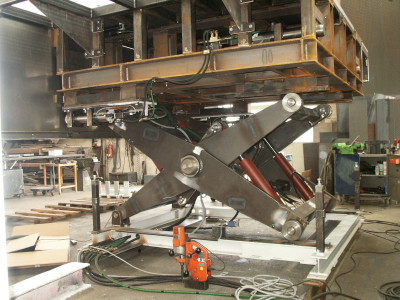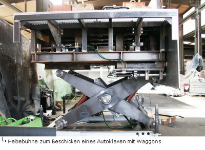 ![]() Hebebühne mit Bolzenverriegelung zu beschicken eines Autoklavs mittels Güterwaggon. |