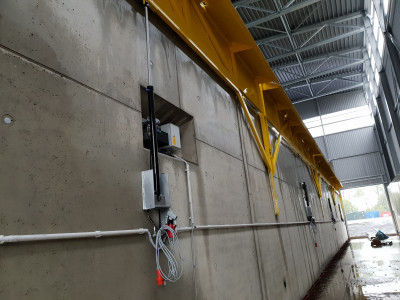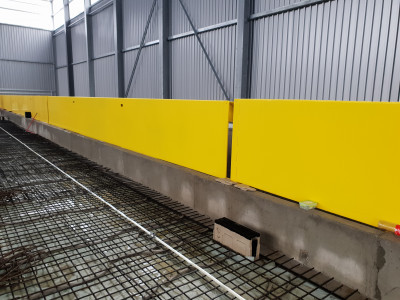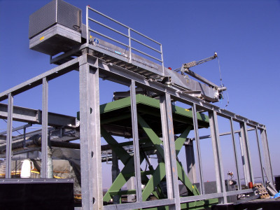 ![]() Elektrohydraulisch höhenverstellbares Geländer mit Schüttrampe in einer Deponie. Die Segmente lassen sich einzeln in 10 m Stücken absenken oder ausfahren. |