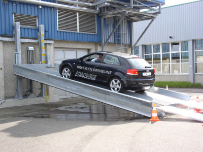 ![]() Fahrversuchsrampe mit automatischer Höhenverstellung um 5° zum Traktions-Tests bei unterschiedlichen Oberflächen. |